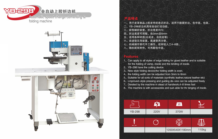 該機(jī)用于鞋帶、箱包、手機(jī)套等各種皮制品的PVC、PU、天然皮、人造皮、布料材質(zhì)的接縫進(jìn)行自動(dòng)分邊,上膠,錘平的多工序一休化作業(yè)。通過該機(jī)操作能提高工作效率,減少工序,不傷面料等優(yōu)點(diǎn).